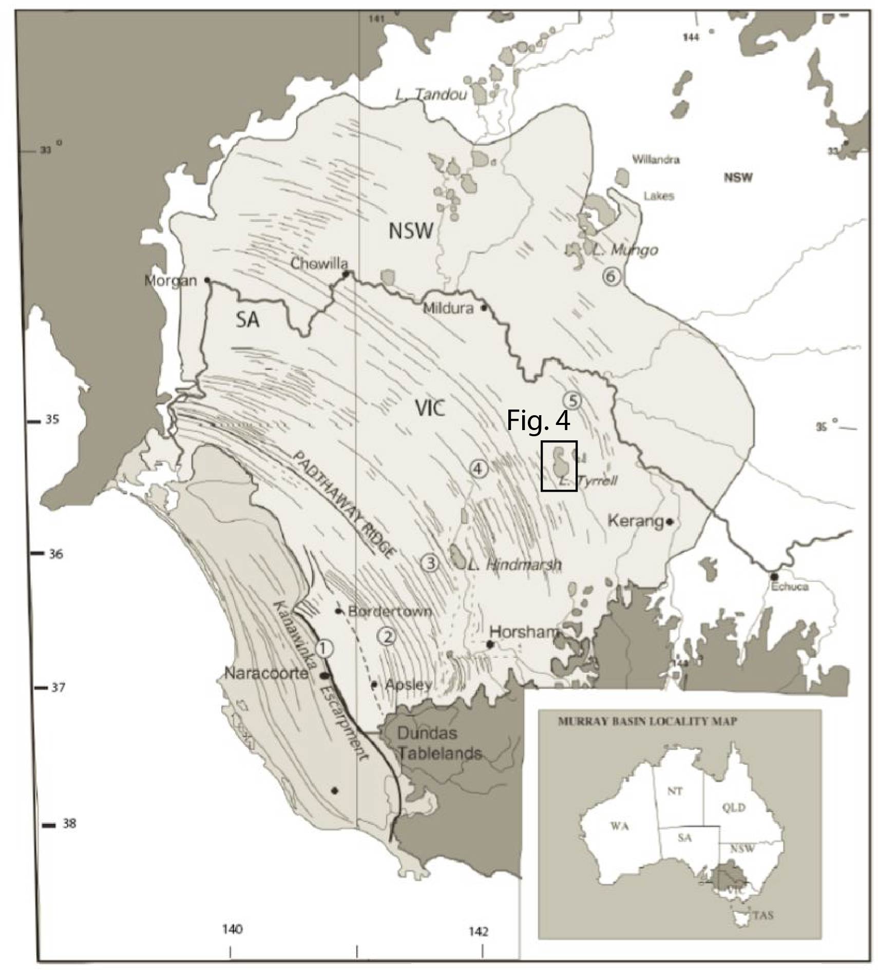 This was true of the Murray Basin in the late Miocene to Early Pliocene (or 2.5 million years ago, Figure 3) where the sea level rose, inundating the land from the present coast between the Fleurieu Peninsula and Mount Gambier in South Australia, forming a large gulf that extended into NSW (including Lake Tyrrell). The sea level was approximately 65m above present levels!