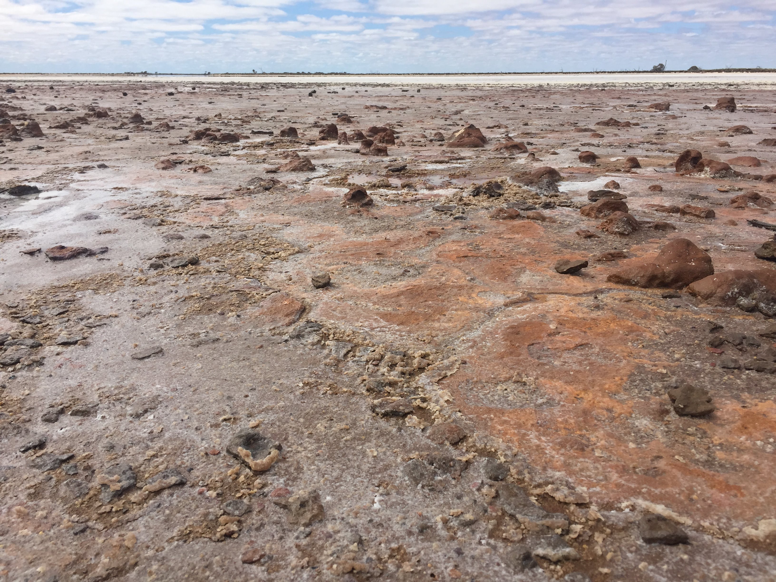 Lake Tyrrell is rich in sodium-chloride (Halite), however, as you wonder around the lake you would be forgiven for thinking it looked a lot like a mine tailings dam. This is because, in addition to Halite and Gypsum, there is also Alunite and Jarosite as well as other Iron-Oxides forming around the lake (Geoscience Australia 2014).
