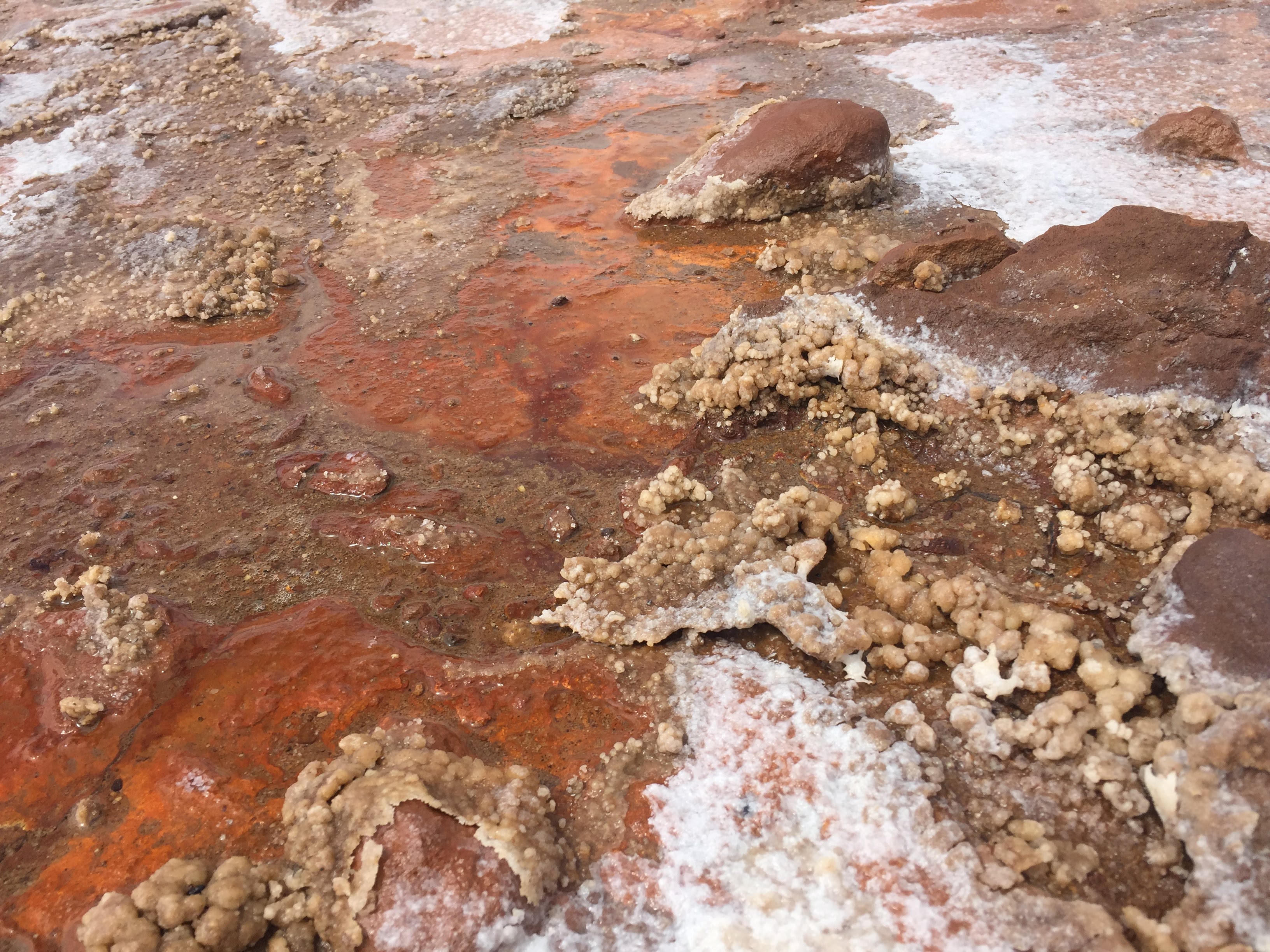 With a pH less than 4, it might seem impossible that anything could live at the lake. There are, however, many microbial communities which have been identified, cycling iron and sulfur species (the reddish-brown organic film seen in Figure 7).
