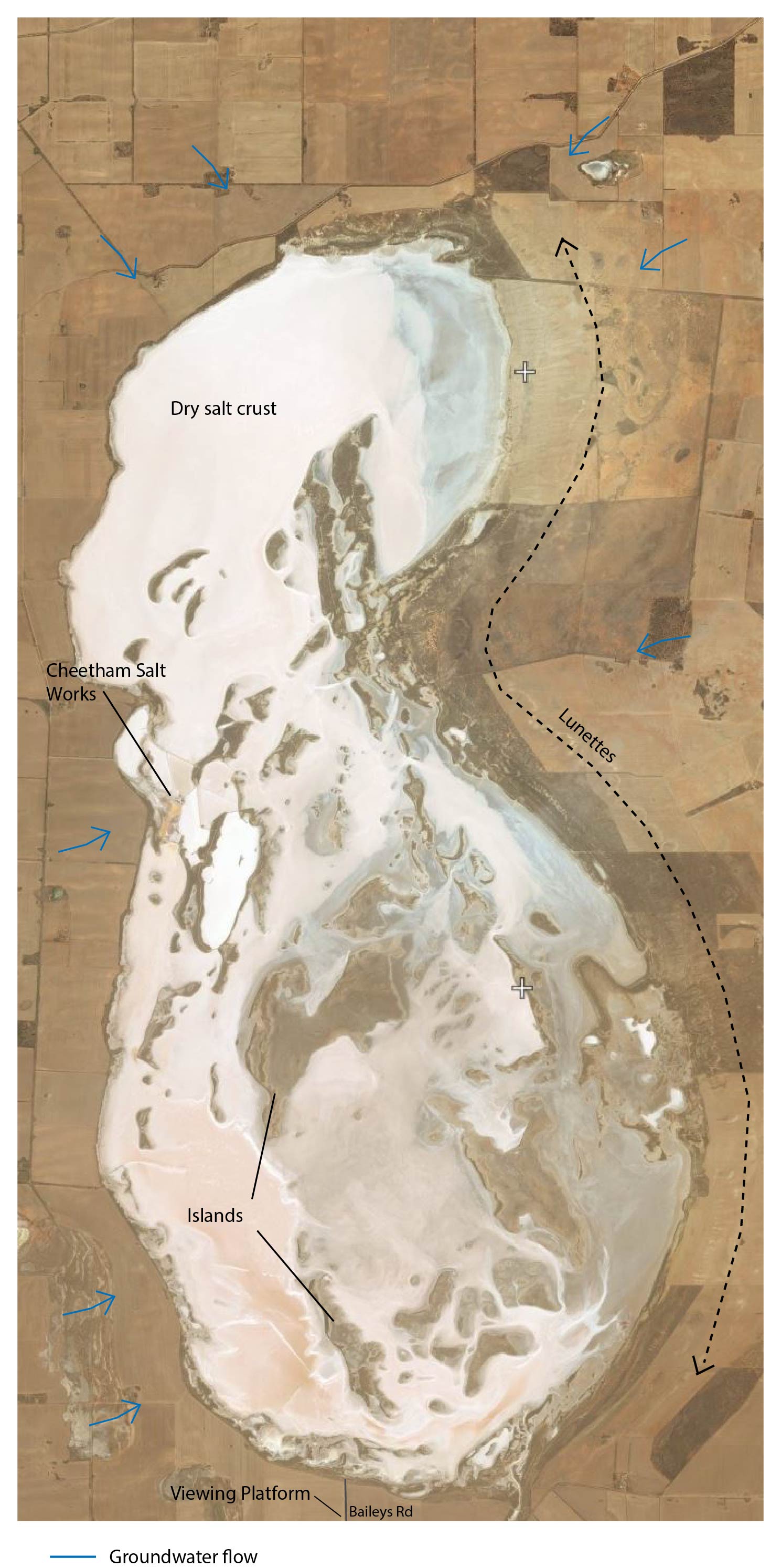 Lake Tyrrell is a groundwater-fed lake (discharge zone) with minor surface-water inflow from Tyrrell Creek (Figure 4). This means that the floor of the lake intercepts the regional water table. To learn more about the hydrology of the lake, read through this Mallee Salinity Workshop.