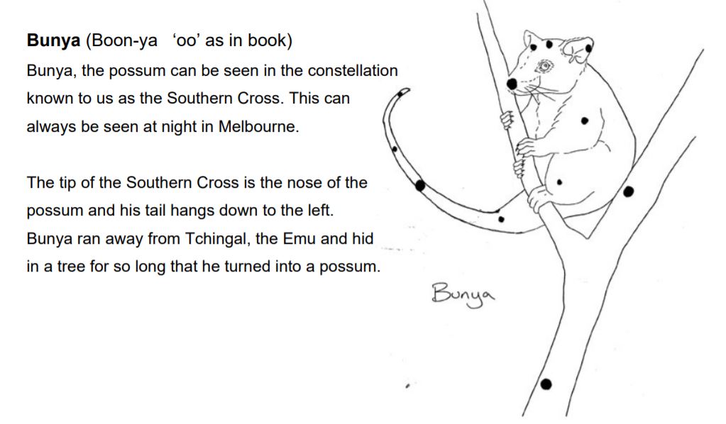 Figure 9 shows an image of Bunya, who was chased up into a tree by the evil emu Tchingal. He waited so long in the tree he turned into a Possum! For more information about the stories of the Boorong people, head to Science Works in Melbourne.